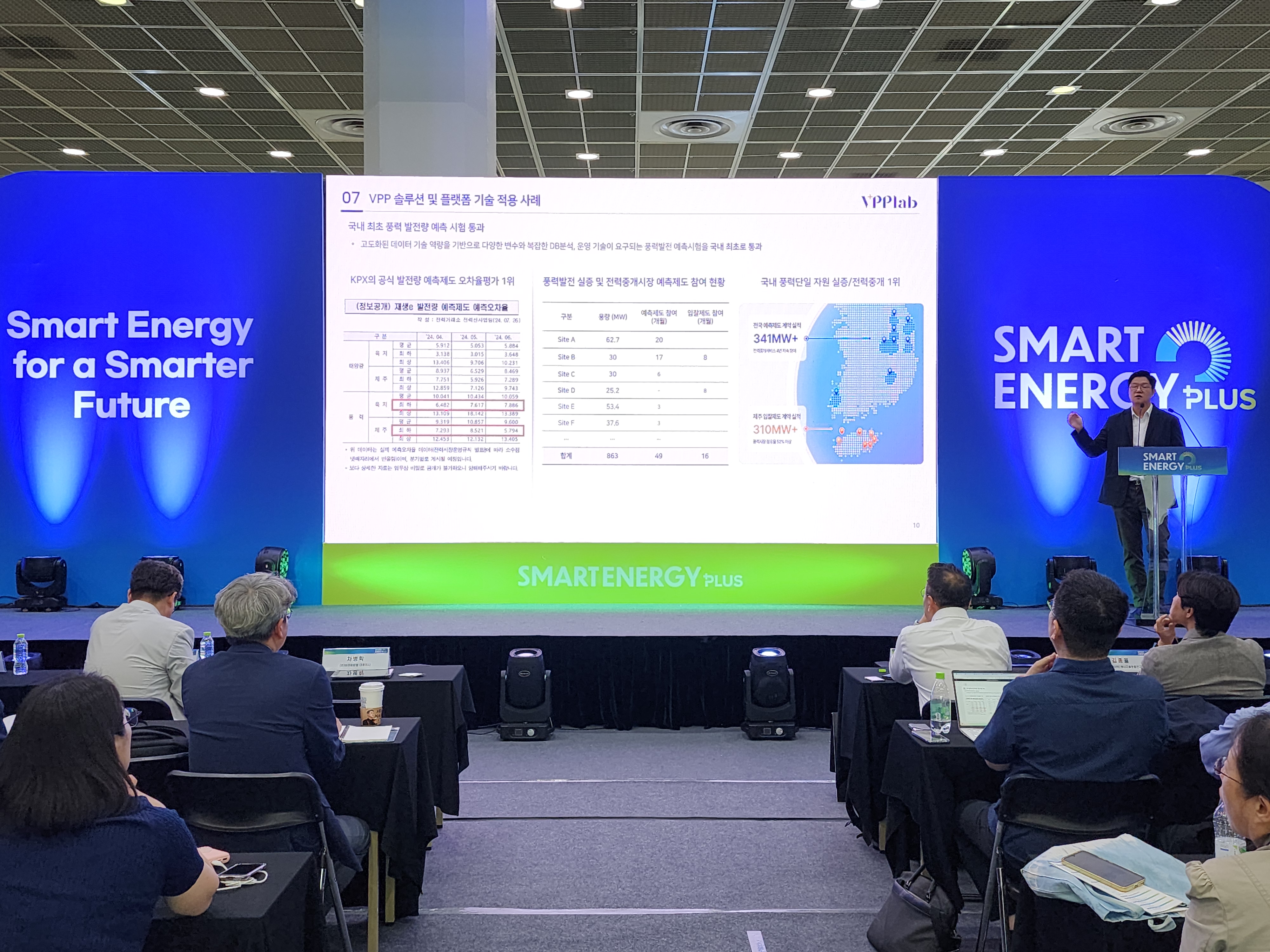 브이피피랩이 10월 15일부터 17일까지 서울 코엑스에서 열린 '스마트에너지플러스(SEP) 2025'에 참석했습니다. 차병학 대표는 '에너지를 위한 AI : 에너지전환 시대, AI의 역할' 세션에서 'VPP(가상발전소) 기반의 솔루션'을 주제로 발표하며, 제주에서 진행 중인 재생에너지 실시간 예측 사업 사례를 소개했습니다.