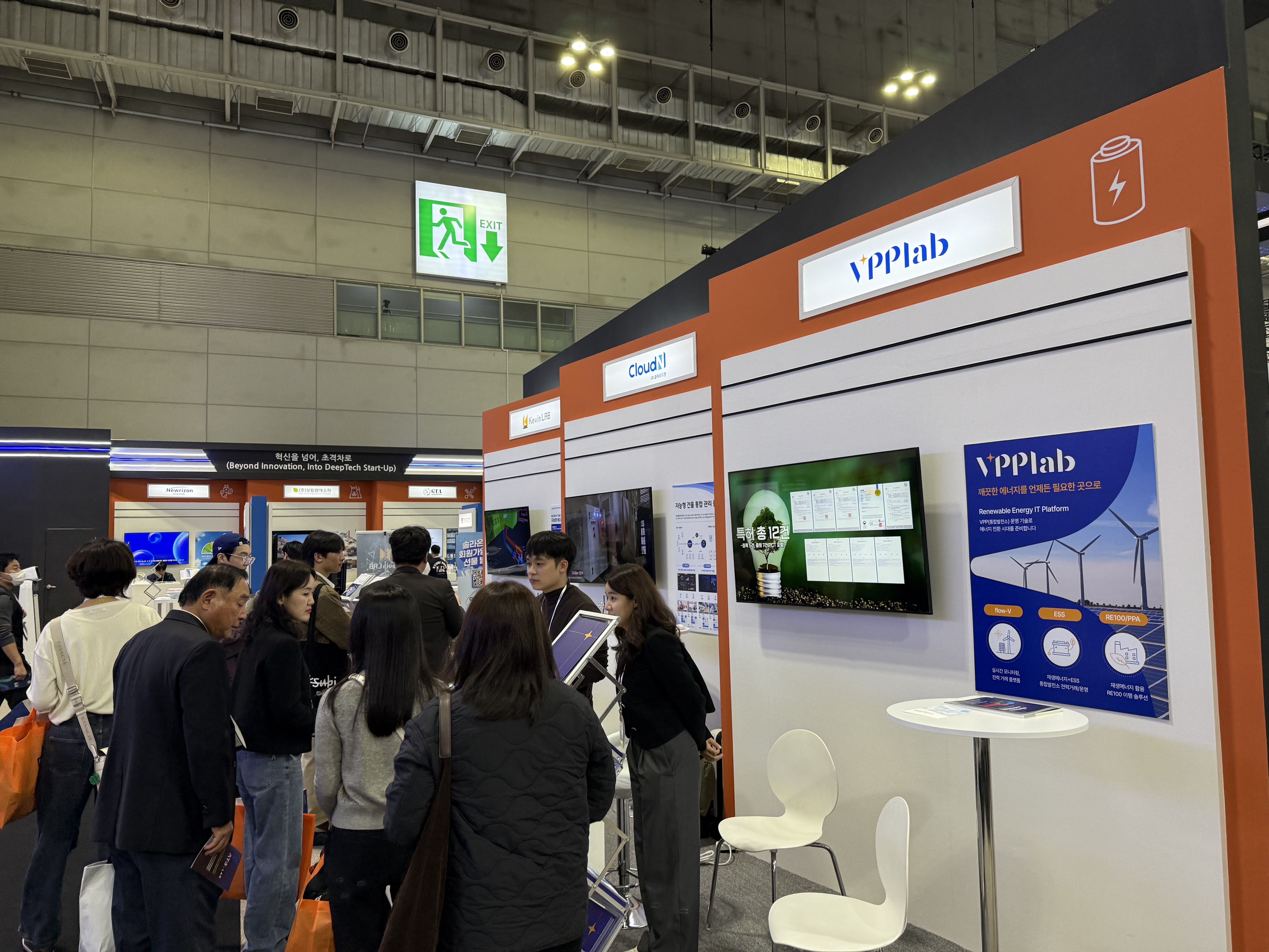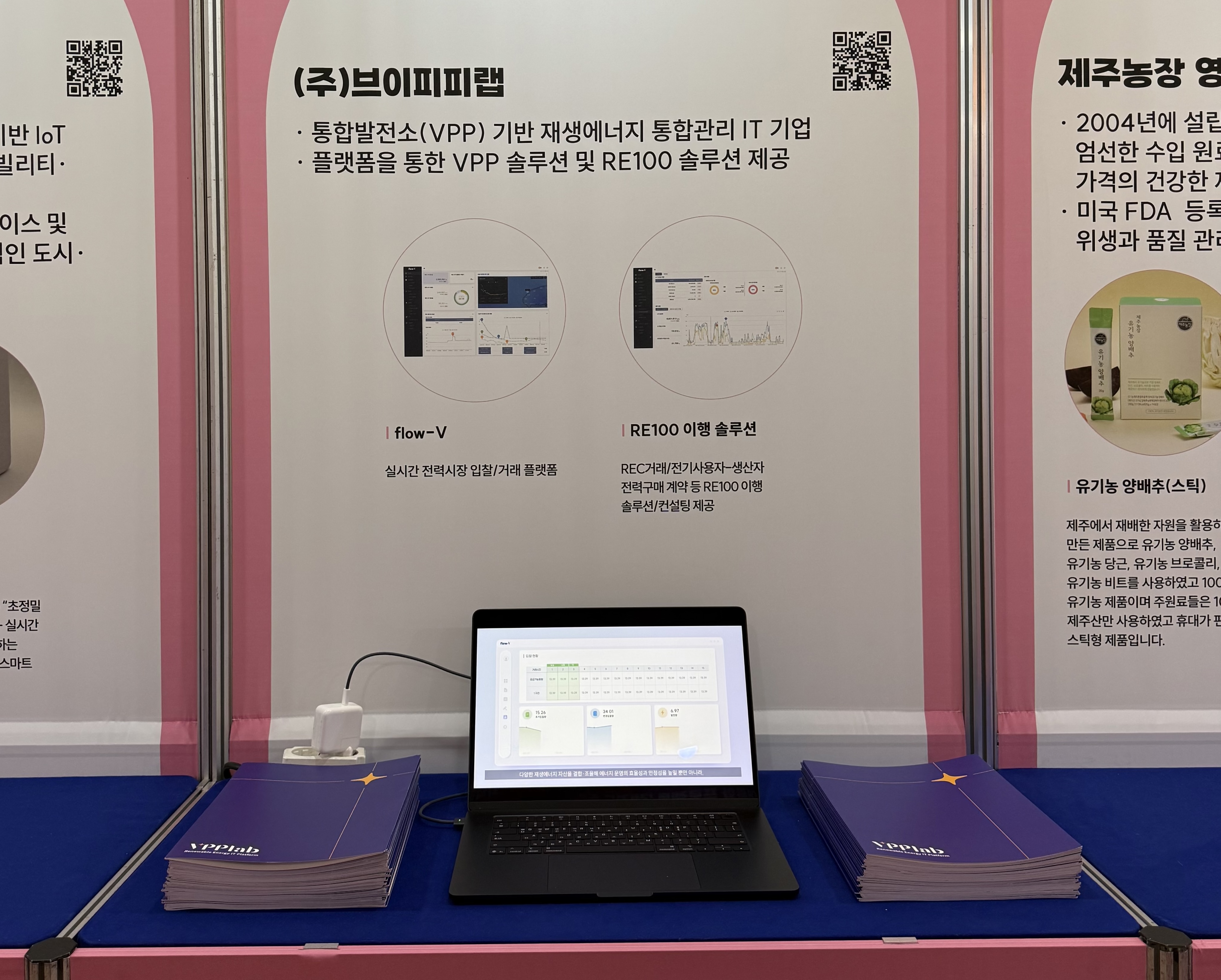 브이피피랩은 전시 현장에서 VPP 기반 재생에너지 자원 통합관리 플랫폼 ‘flow-V’, ESS 활용 전력거래·운영 기술, RE100 솔루션을 소개하며 다양한 관람객들과 업계 관계자들의 관심을 받았습니다. 또한 제주 실시간 입찰 시장 운영 경험을 공유하고, 향후 제도 확대와 협력 가능성에 대해서도 심도 있게 논의했습니다.