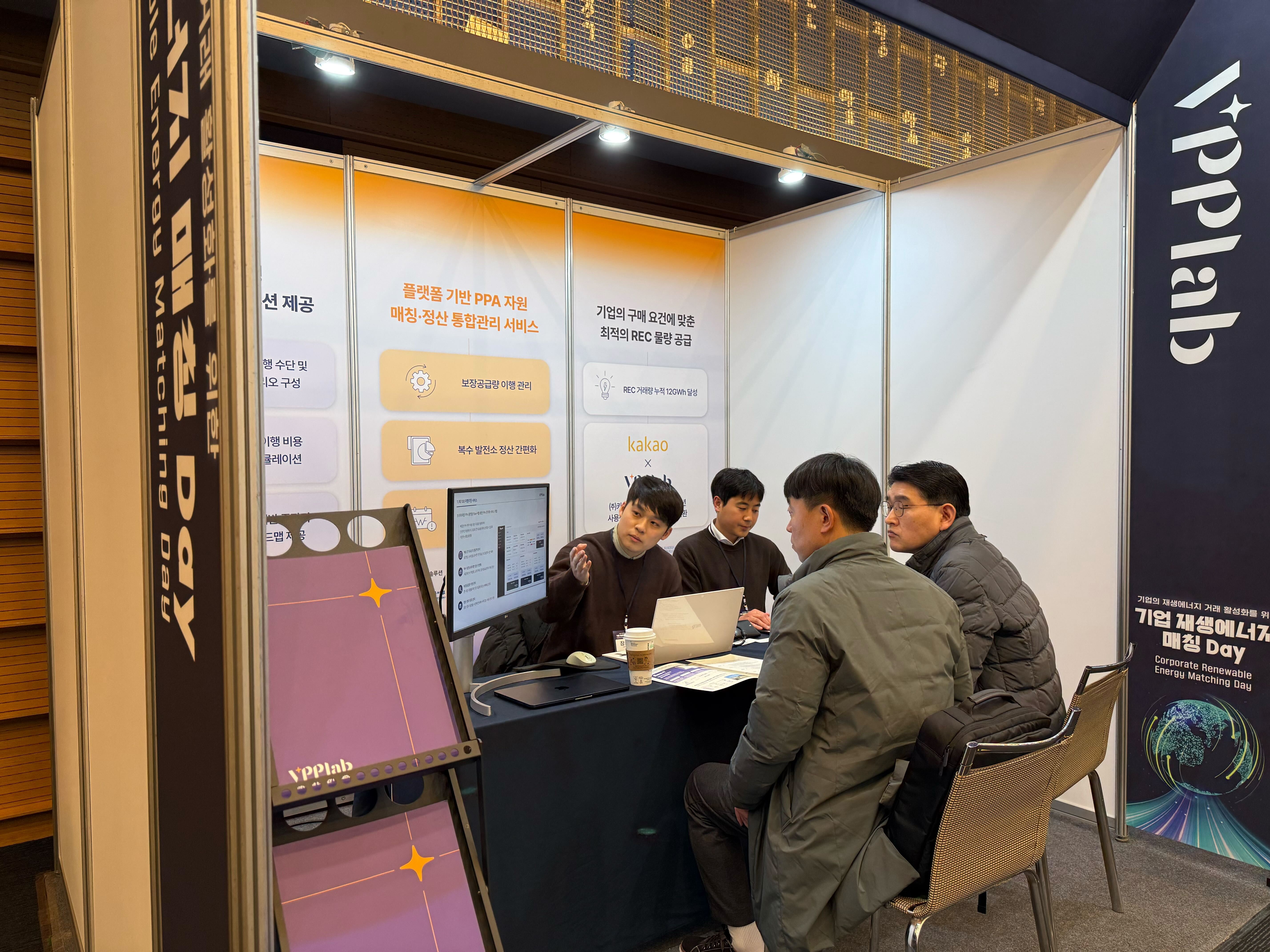 브이피피랩은 현장에서 재생에너지 거래 상담 부스를 운영하며, PPA·REC 등 구매 방식별 거래 구조와 기업 상황에 맞는 재생에너지 조달 방안을 소개하였고, VPP 기반 전력중개 플랫폼과 비용 예측 시뮬레이션을 통해 보다 현실적인 재생에너지 도입 방안을 제안했습니다.