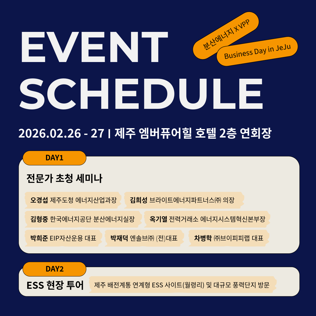 자세한 안내와 참가 신청은 2월 초에 다시 전해드릴 예정이며, 국내 첫 분산에너지 특화지역인 제주에서 분산에너지와 VPP 산업 종사자분들과 깊이 있는 논의와 네트워킹의 장을 만들어가고자 합니다.